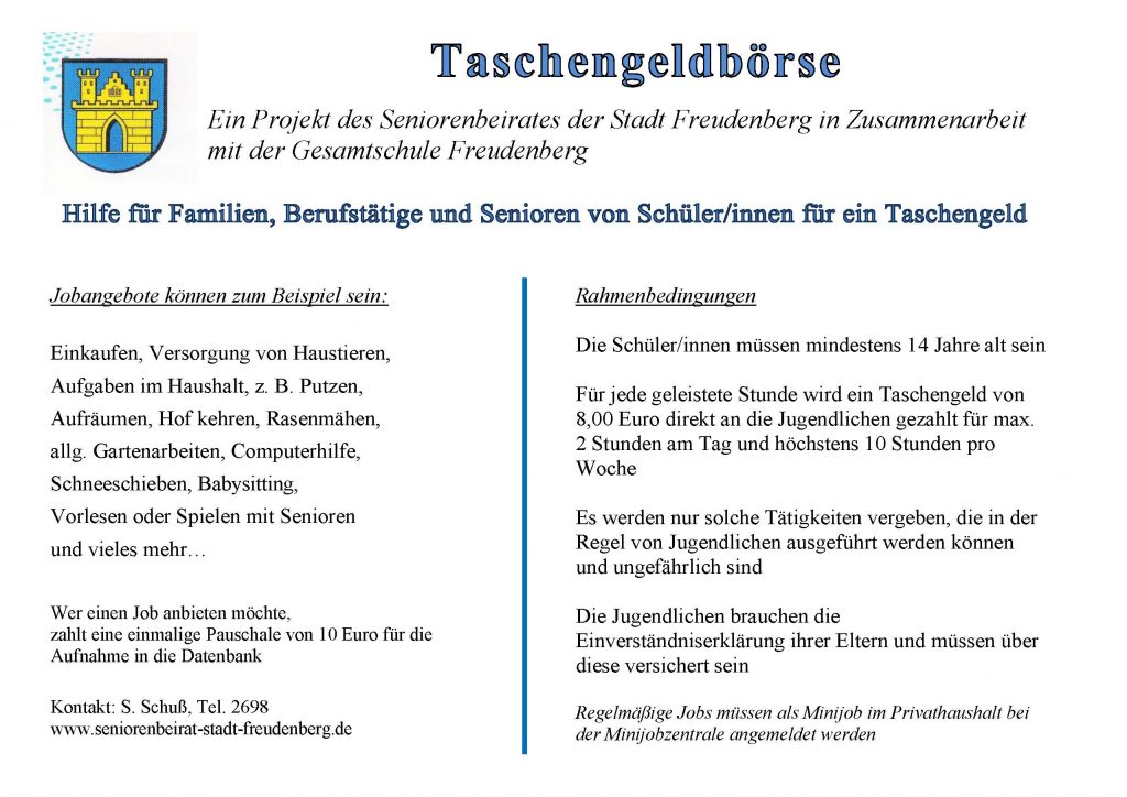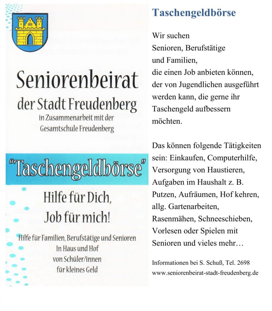 Der Seniorenbeirat der Stadt Freudenberg bietet ein Projekt an, bei dem junge und alte Menschen voneinander profitieren. Die Vermittlungsstelle des Seniorenbeirates führt Anbieter und Jugendliche zusammen und unterstützt die Beteiligten.